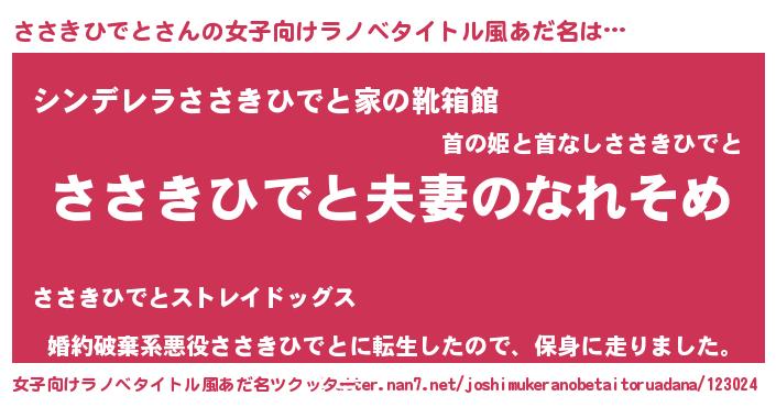 | 男性向けラノベタイトル風あだ名 | 『おまえをオタクにしてやるから、俺をささきひでとにしてくれ! 』 |