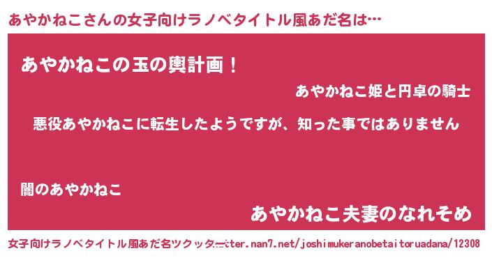 | 男性向けラノベタイトル風あだ名 | 『この素晴らしい世界にあやかねこを!』 |