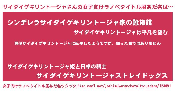 | 男性向けラノベタイトル風あだ名 | 『この素晴らしい世界にサイダイゲキリントージャを!』 |