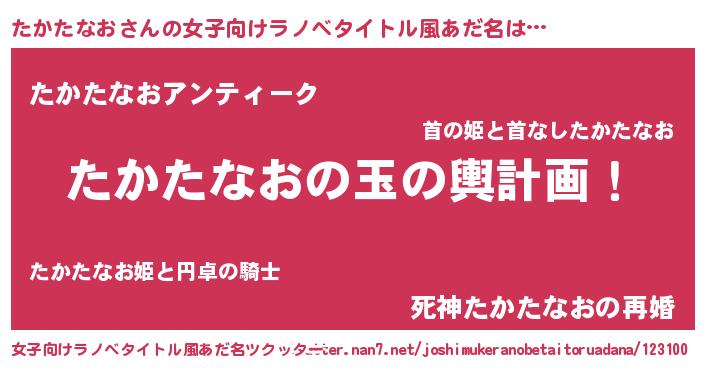 | 男性向けラノベタイトル風あだ名 | 『転生したらたかたなおだった件』 |