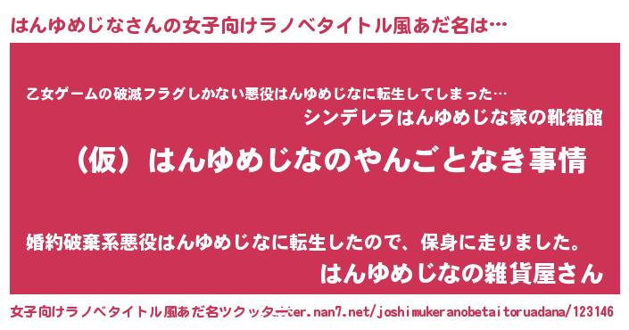 | 男性向けラノベタイトル風あだ名 | 『はんゆめじなの憂鬱』 |