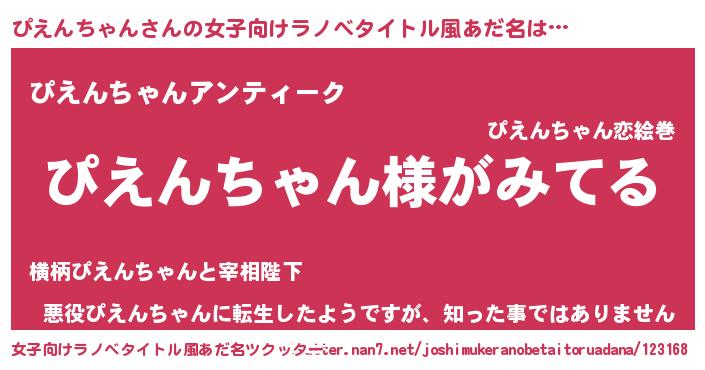 | 男性向けラノベタイトル風あだ名 | 『ぴえんちゃんの嫁は女の子じゃないと思った?』 |