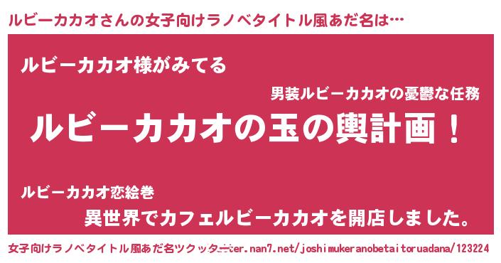 | 男性向けラノベタイトル風あだ名 | 『ルビーカカオ~年齢イコール彼女いない歴の魔法使い~』 |
