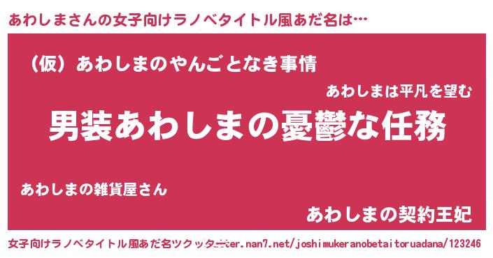 あわしまさんの女子向けラノベタイトル風あだ名は… 『男装あわしまの憂鬱な任務』『(仮)あわしまのやんごとなき事情』『あわしまの契約王妃』 ツクッター #女子向けラノベタイトル風あだ名ツクッター http://tkutter.nan7.net/joshimukeranobetaitoruadana/123246/