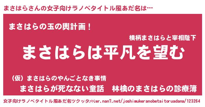 まさはらさんの女子向けラノベタイトル風あだ名は… 『まさはらは平凡を望む』『まさはらの玉の輿計画!』『まさはらが死なない童話 林檎のまさはらの診療簿』 ツクッター #女子向けラノベタイトル風あだ名ツクッター http://tkutter.nan7.net/joshimukeranobetaitoruadana/123264/