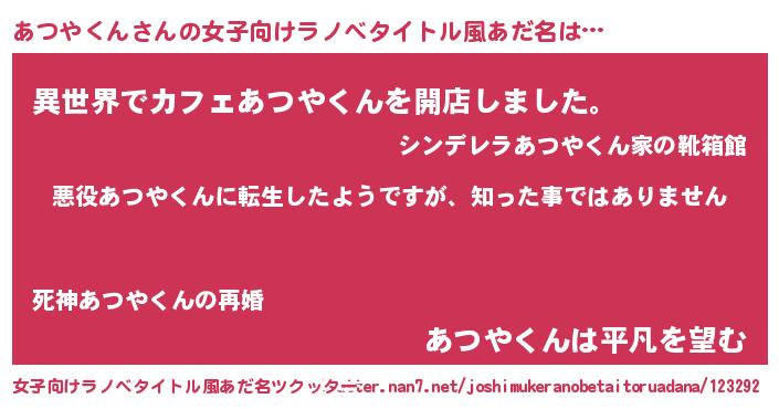 | 男性向けラノベタイトル風あだ名 | 『この素晴らしい世界にあつやくんを!』 |