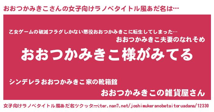 おおつかみきこさんの女子向けラノベタイトル風あだ名は… 『おおつかみきこ様がみてる』『乙女ゲームの破滅フラグしかない悪役おおつかみきこに転生してしまった…』『おおつかみきこの雑貨屋さん』 ツクッター #女子向けラノベタイトル風あだ名ツクッター http://tkutter.nan7.net/joshimukeranobetaitoruadana/12330/