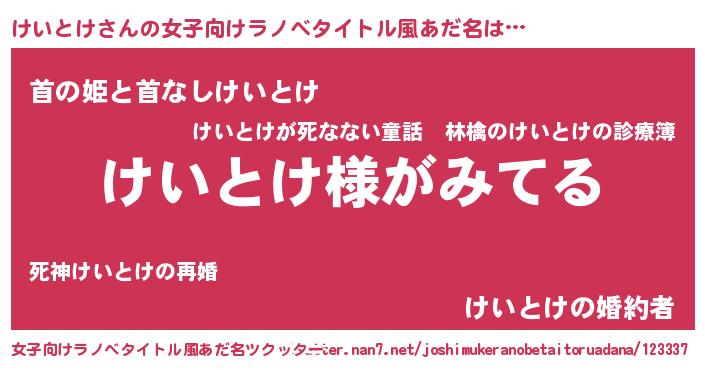 | 男性向けラノベタイトル風あだ名 | 『けいとけの嫁は女の子じゃないと思った?』 |