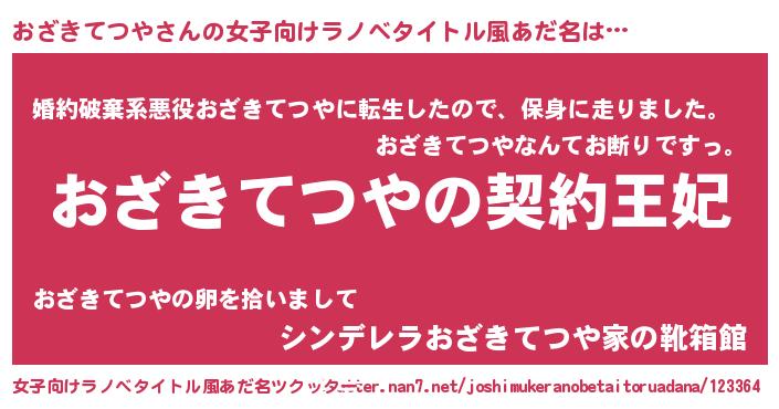 | 男性向けラノベタイトル風あだ名 | 『誰もが恐れるあのおざきてつやが、ぼくの専属メイドになるようです。』 |