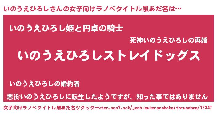 | 男性向けラノベタイトル風あだ名 | 『Re:いのうえひろしから始める異世界生活』 |