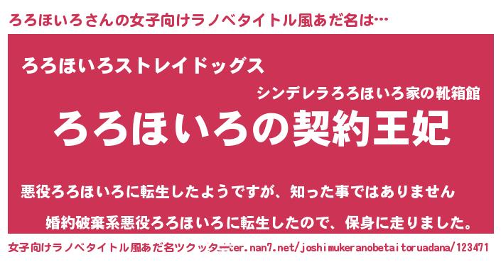 | 男性向けラノベタイトル風あだ名 | 『ろろほいろという概念が存在しない退屈な世界 』 |