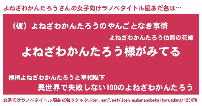 | 男性向けラノベタイトル風あだ名 | 『よねざわかんたろうの嫁は女の子じゃないと思った?』 |