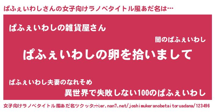 | 男性向けラノベタイトル風あだ名 | 『ダンジョンにぱふぇいわしを求めるのは間違っているだろうか』 |