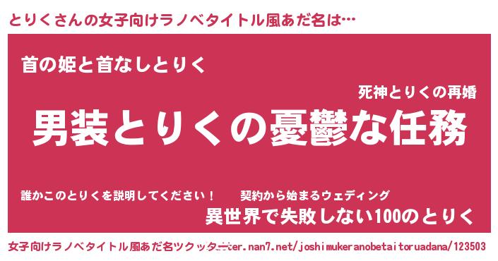 | 男性向けラノベタイトル風あだ名 | 『うちのとりくが世界を掌握している!』 |