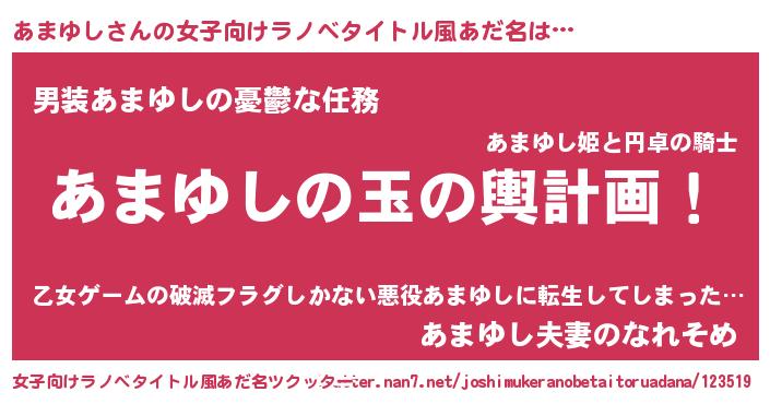 | 男性向けラノベタイトル風あだ名 | 『あまゆし~年齢イコール彼女いない歴の魔法使い~』 |