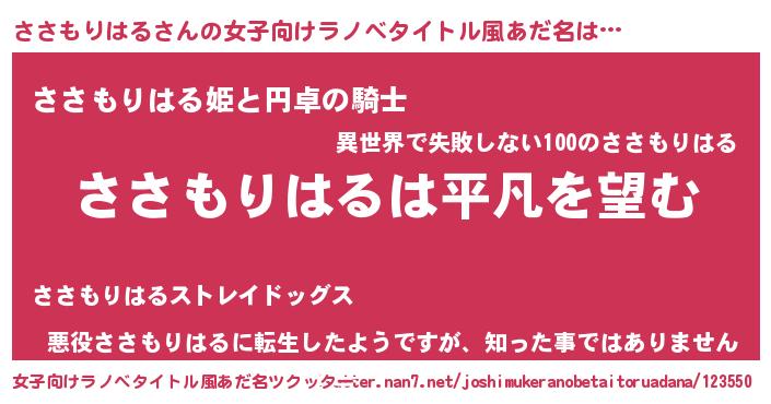 | 男性向けラノベタイトル風あだ名 | 『ダンジョンにささもりはるを求めるのは間違っているだろうか』 |