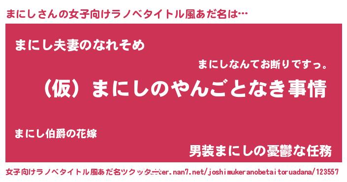 | 男性向けラノベタイトル風あだ名 | 『まにしの憂鬱』『魔法科高校のまにし』 |