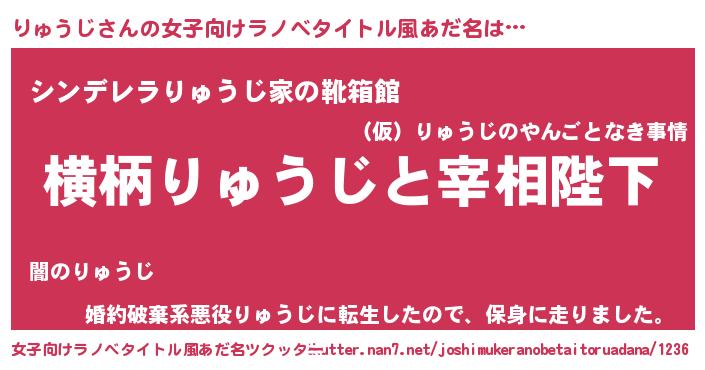 | 男性向けラノベタイトル風あだ名 | 『りゅうじに滅ぼされるだけの簡単なお仕事です』 |