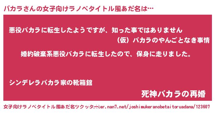 バカラさんの女子向けラノベタイトル風あだ名は… 『婚約破棄系悪役バカラに転生したので、保身に走りました。』『悪役バカラに転生したようですが、知った事ではありません』『死神バカラの再婚』 ツクッター #女子向けラノベタイトル風あだ名ツクッター http://tkutter.nan7.net/joshimukeranobetaitoruadana/123607/