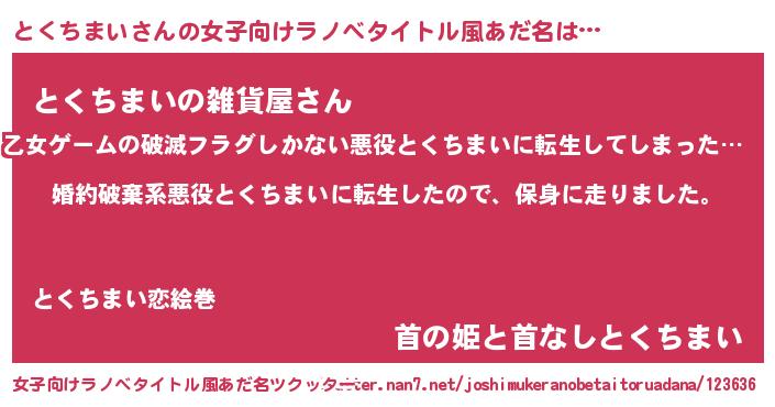 | 男性向けラノベタイトル風あだ名 | 『トクチマイスレイヤー』 |
