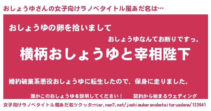 | 男性向けラノベタイトル風あだ名 | 『おしょうゆに滅ぼされるだけの簡単なお仕事です』 |