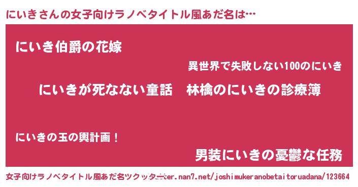 | 男性向けラノベタイトル風あだ名 | 『魔弾の王とにいき』 |