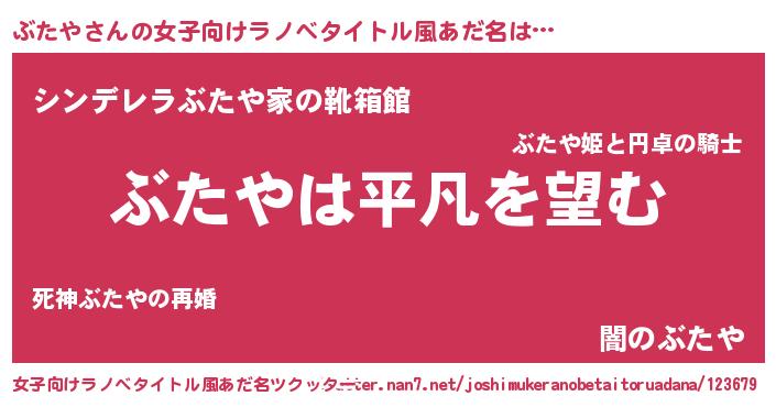 ぶたやさんの女子向けラノベタイトル風あだ名は… 『ぶたやは平凡を望む』『シンデレラぶたや家の靴箱館』『闇のぶたや』 ツクッター #女子向けラノベタイトル風あだ名ツクッター http://tkutter.nan7.net/joshimukeranobetaitoruadana/123679/