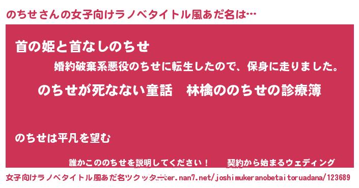 | 男性向けラノベタイトル風あだ名 | 『魔弾の王とのちせ』『ノチセスレイヤー』 |