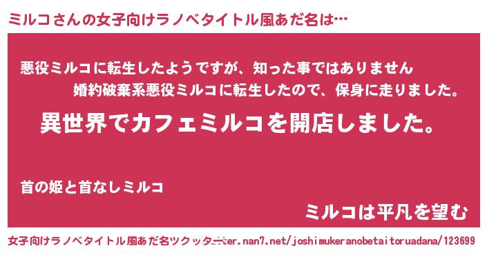 | 男性向けラノベタイトル風あだ名 | 『誰もが恐れるあのミルコが、ぼくの専属メイドになるようです。』 |