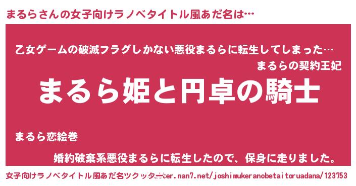 まるらさんの女子向けラノベタイトル風あだ名は… 『まるら姫と円卓の騎士』『乙女ゲームの破滅フラグしかない悪役まるらに転生してしまった…』『婚約破棄系悪役まるらに転生したので、保身に走りました。』 ツクッター #女子向けラノベタイトル風あだ名ツクッター http://tkutter.nan7.net/joshimukeranobetaitoruadana/123753/