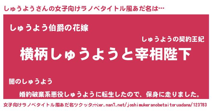 | 男性向けラノベタイトル風あだ名 | 『しゅうように滅ぼされるだけの簡単なお仕事です』 |