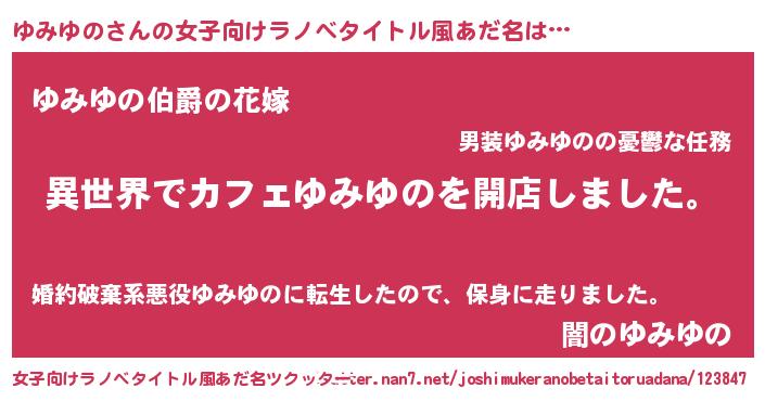 | 男性向けラノベタイトル風あだ名 | 『誰もが恐れるあのゆみゆのが、ぼくの専属メイドになるようです。』 |