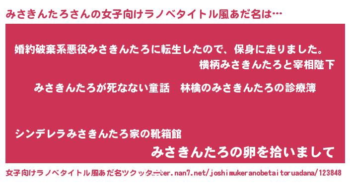 | 男性向けラノベタイトル風あだ名 | 『魔弾の王とみさきんたろ』 |