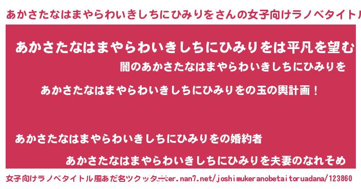 | 男性向けラノベタイトル風あだ名 | 『あかさたなはまやらわいきしちにひみりを~年齢イコール彼女いない歴の魔法使い~』 |