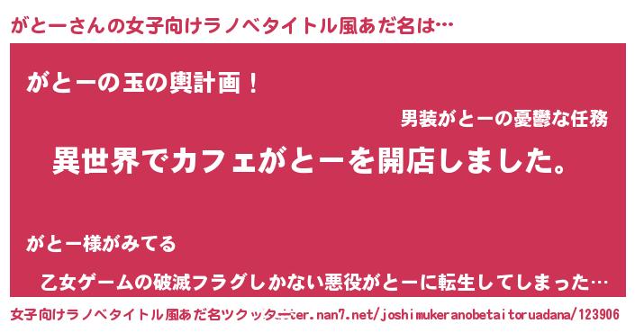 | 男性向けラノベタイトル風あだ名 | 『誰もが恐れるあのがとーが、ぼくの専属メイドになるようです。』 |