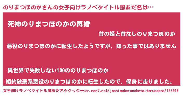 | 男性向けラノベタイトル風あだ名 | 『この素晴らしい世界にのりまつほのかを!』 |