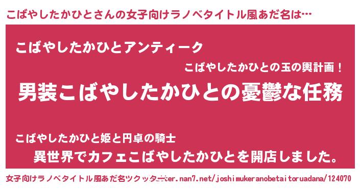 | 男性向けラノベタイトル風あだ名 | 『冴えないこばやしたかひとの育てかた』 |