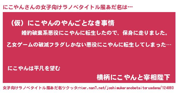 | 男性向けラノベタイトル風あだ名 | 『魔弾の王とにこやん』『にこやんの憂鬱』 |