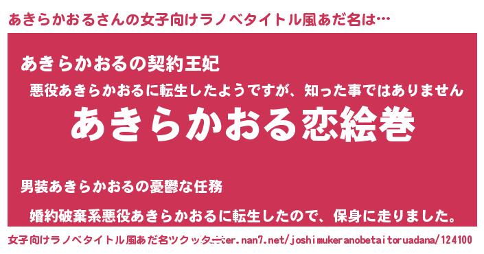 | 男性向けラノベタイトル風あだ名 | 『おまえをオタクにしてやるから、俺をあきらかおるにしてくれ! 』 |