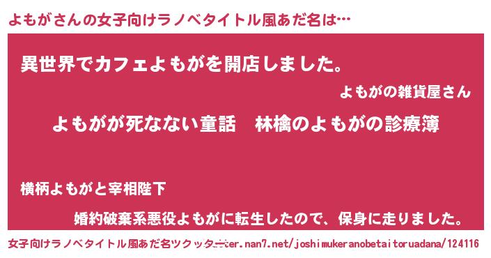 | 男性向けラノベタイトル風あだ名 | 『魔弾の王とよもが』『ヨモガスレイヤー』 |