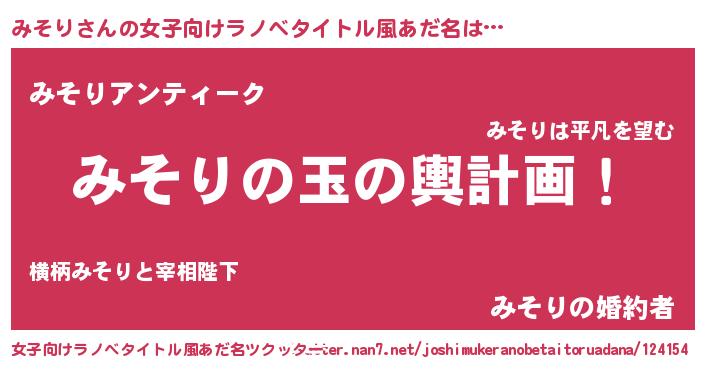| 男性向けラノベタイトル風あだ名 | 『みそり~年齢イコール彼女いない歴の魔法使い~』 |