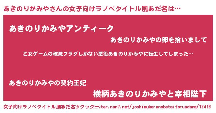 | 男性向けラノベタイトル風あだ名 | 『この素晴らしい世界にあきのりかみやを!』 |
