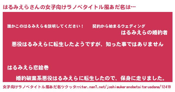 | 男性向けラノベタイトル風あだ名 | 『この素晴らしい世界にはるみえらを!』 |