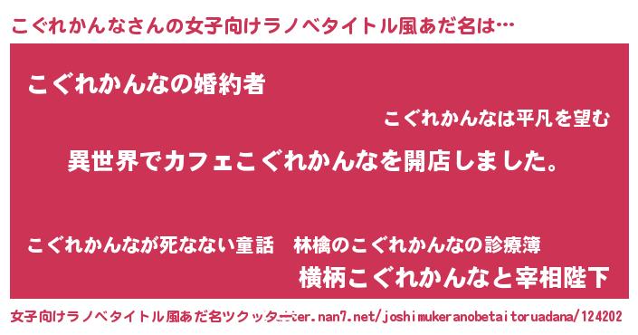 こぐれかんなさんの女子向けラノベタイトル風あだ名は… 『異世界でカフェこぐれかんなを開店しました。』『こぐれかんなの婚約者』『横柄こぐれかんなと宰相陛下』 ツクッター #女子向けラノベタイトル風あだ名ツクッター http://tkutter.nan7.net/joshimukeranobetaitoruadana/124202/