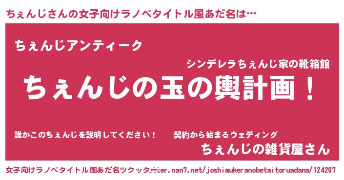 | 男性向けラノベタイトル風あだ名 | 『ちぇんじ~年齢イコール彼女いない歴の魔法使い~』 |