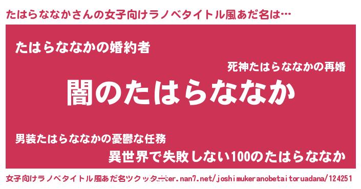 | 男性向けラノベタイトル風あだ名 | 『Re:たはらななかから始める異世界生活』 |