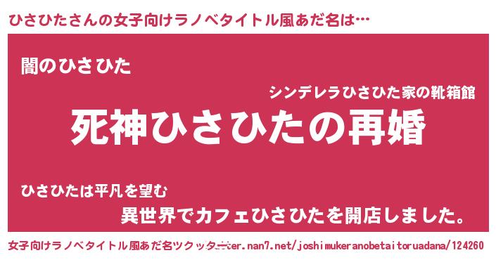 | 男性向けラノベタイトル風あだ名 | 『ノーゲーム・ノーヒサヒタ』 |