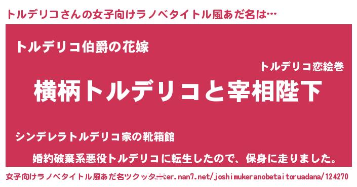 | 男性向けラノベタイトル風あだ名 | 『トルデリコに滅ぼされるだけの簡単なお仕事です』 |