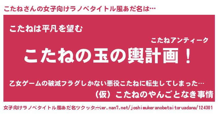 | 男性向けラノベタイトル風あだ名 | 『こたね~年齢イコール彼女いない歴の魔法使い~』 |