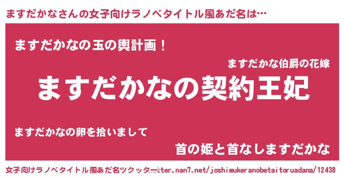 ますだかなさんの女子向けラノベタイトル風あだ名は… 『ますだかなの契約王妃』『ますだかなの玉の輿計画!』『首の姫と首なしますだかな』 ツクッター #女子向けラノベタイトル風あだ名ツクッター http://tkutter.nan7.net/joshimukeranobetaitoruadana/12438/